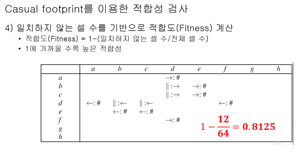 마지막으로, 변환한 두 Causal Footprints의 일치도를 구하면 우리가 하고자 했던 적합도 검정(Conformance Checking)의 적합성(Fitness)을 나타내는 지표를 얻을 수 있습니다.