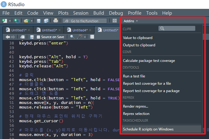 R은 실행을 위한 언어이고, 키보드나 마우스를 대신 눌러주는 keyboard simulator 패키지, 언제 이 일을 해줬으면 좋겠는지 스케줄링 할 수 있는 taskscheduleR 패키지입니다.