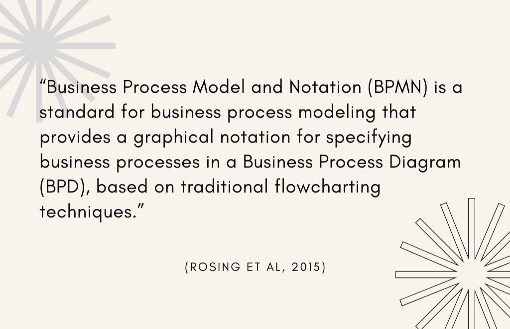 Business Process Model and Notation (BPMN) is a standard for business process modeling that provides a graphical notation for specifying business processes in a Business Process Diagram (BPD), based on a flowcharting technique very similar to activity diagrams from Unified Modeling Language (UML). (위키피디아 참고)