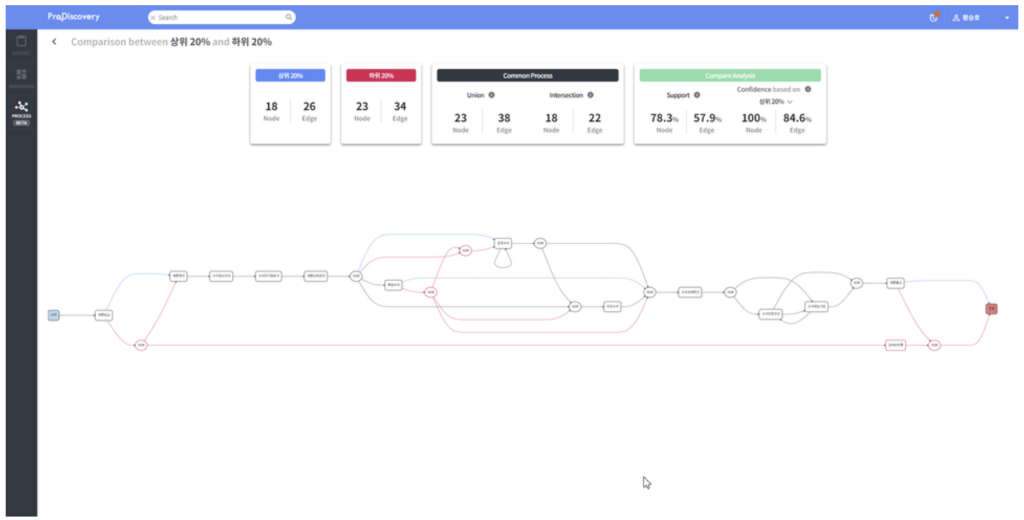 위와 같이 비교된 프로세스에서는 두 프로세스가 어떤 부분에서 차이 나는지 시각적으로 제공하며, 작업(Node)과 플로우(Edge)들이 얼마나 일치하는지에 대한 수치를 제공합니다.