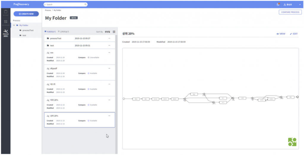 또한, 업데이트된(build 2.0.15 기준) ProDiscovery에서는 BPMN을 활용한 프로세스 관리, 비교 기능이 추가되었습니다.