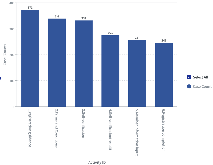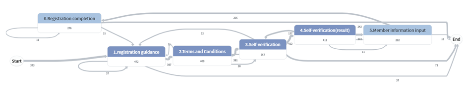 Interpreting the Frequency-Based Map reveals that after entering the registration process, there is a direct pathway to the endpoint after 1) registration guidance and 3) self-verification. This indicates a significant dropout rate at these stages. The repetition between 1) registration guidance and 3) self-verification, as well as the reversal from 4) self-verification (result) to 3) self-verification, suggests the possibility of users failing the self-verification and reverting to the previous stage. Additionally, it is evident from the varying shades of nodes that users spend a relatively long time in the user information input and self-verification stages.