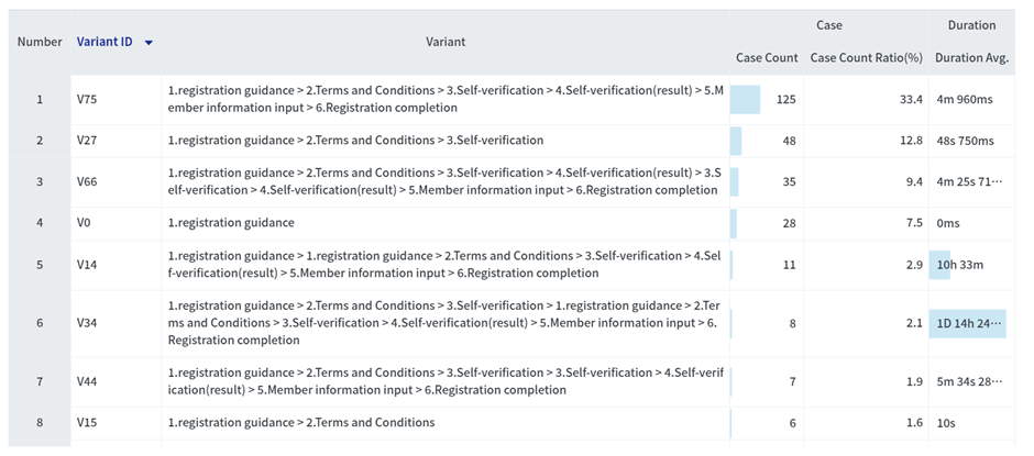When examining the top patterns (customer behavior patterns), it’s expected that the most prevalent pattern, accounting for the highest proportion, aligns with the ideal pattern envisioned by the planners of the registration process. On average, customers take around 4 minutes to complete the registration process in this top pattern.