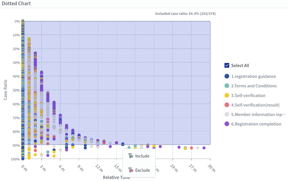 (Interpreting the Dotted Chart: Consider the series of dots as representing coordinates along a horizontal axis, from left to right (starting with Step 1, registration guidance, and ending with Step 6, registration completion) over time. The x-coordinate of the far-right point represents the final completion time, with 0m (minutes) marking the starting point at Step 1 (registration guidance). For example, customers located around the y-axis at 50% have completed Steps 1 to 6 in approximately 5 minutes.)