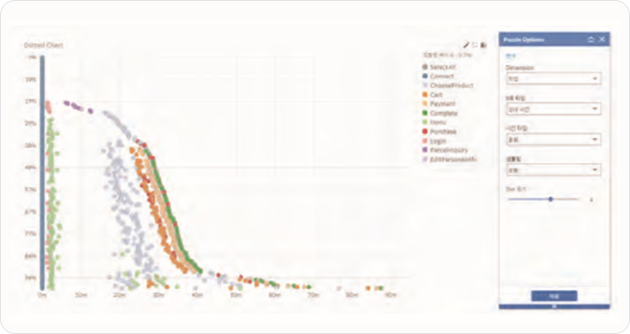 - 프로세스 마이닝 기반 공정 분석을 활용하여 Dotted Chart를 이용한 프로세스 패턴 분석, 프로세스 모델 분석, 성과 분석, 소셜 네트워크 분석 등을 수행할 수 있습니다. 작업의 흐름을 나타내는 프로세스 모델 뿐 아니라 소셜 네트워크 분석을 통해 제조 프로세스에 참여하는 작업자, 작업부서 혹은 장비간의 흐름을 분석할 수 있습니다.