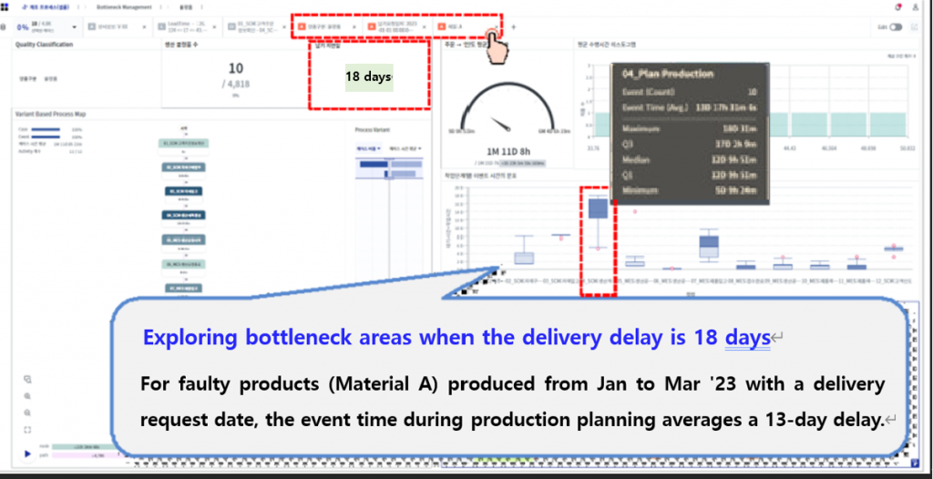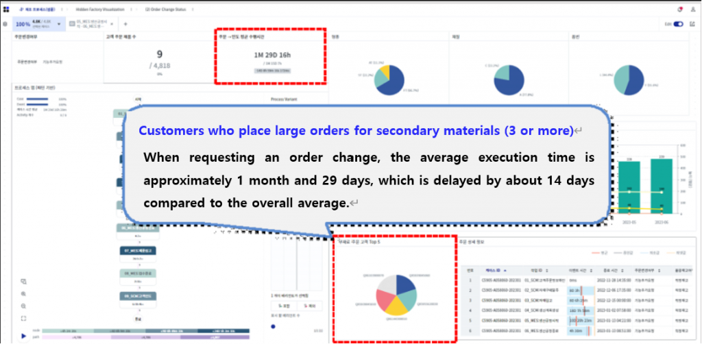 Both Supply Chain Management (SCM) and Manufacturing Execution Systems (MES) in manufacturing companies contain data related to production schedules. Therefore, by analyzing event logs extracted from these systems through process mining, it becomes easy to identify how issues arising from inventory management can lead to production delays and more.