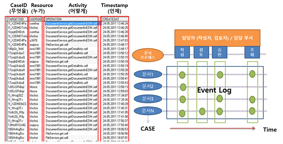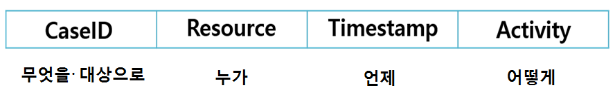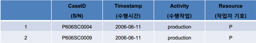 · 수행 대상(Case ID): 여러 개의 업무로 구성된 하나의 프로세스에서 주요 키(Key)가 되는 속성입니다.