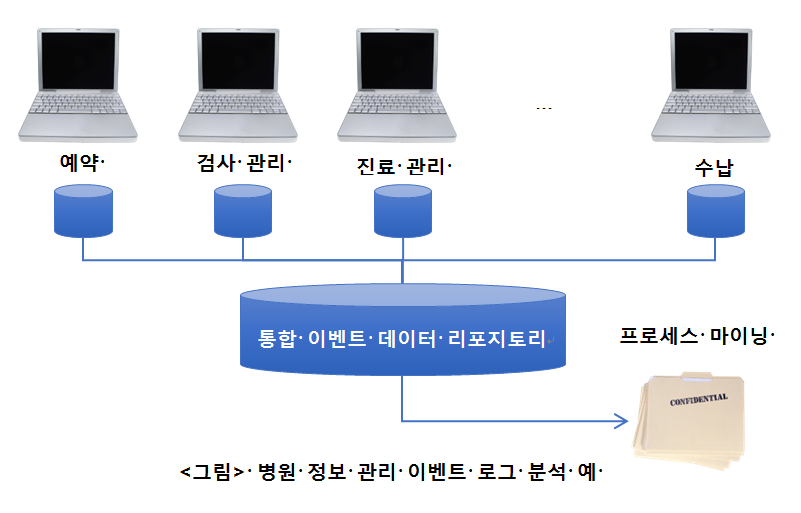 다음은 고객 만족도 향상 및 업무 효율화를 위해 병원정보시스템 내의 개별 시스템 혹은 업무 DB 테이블로부터 데이터를 취합하는 사례입니다. 이렇게 수집된 데이터에 프로세스 마이닝을 적용하여 환자가 내원하여 귀가할 때까지의 이동 동선과 서비스 흐름을 파악할 수가 있습니다.
