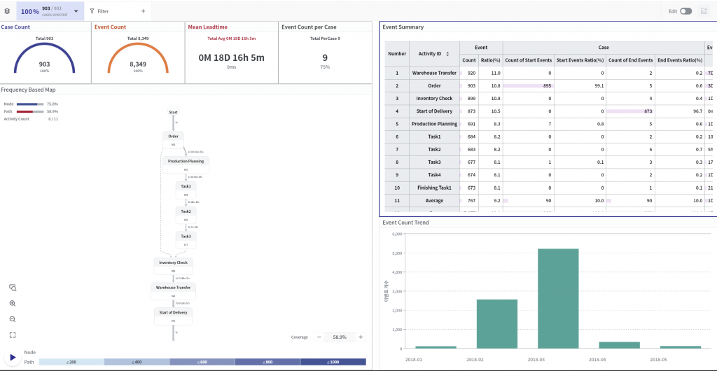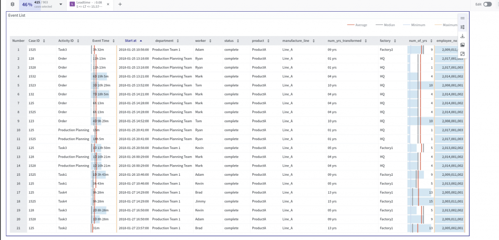 So, how can Pro Discovery 3.0 assist Researcher A? By utilizing the filtering and event data download functions effectively, valuable data can be obtained. By using the filtering function, you can distinguish between processes with short lead time and processes with longer lead time, among other criteria, and construct datasets accordingly.