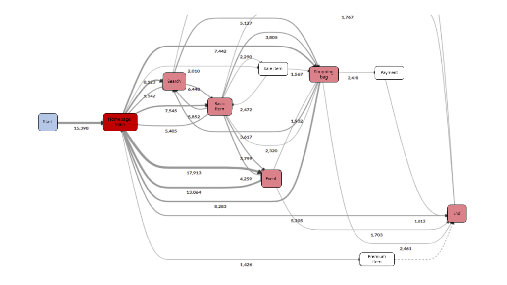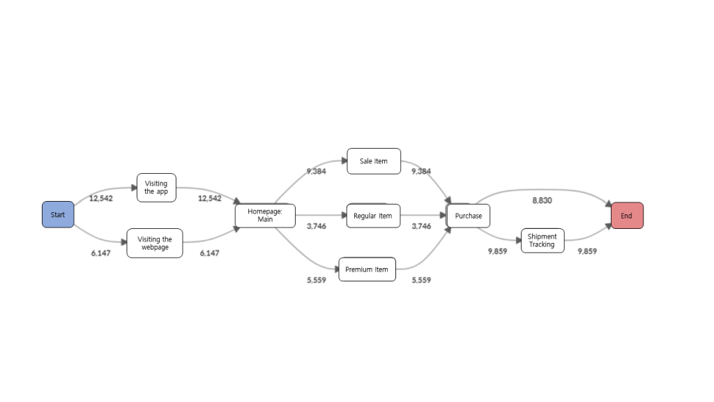 We start by examining log data from an online pet store app, mapping out the customer journey in a process map, as shown in Figure 1. This process map reveals insights into customer navigation, highlighting which pages are most frequently visited. For instance, out of five customers who visited the pet store app, three accessed it through the app itself. Additionally, it becomes evident that customers show a strong preference for sale items, followed by premium and regular products.