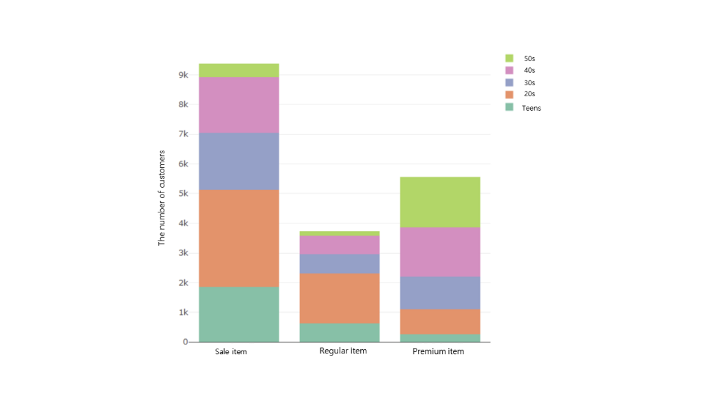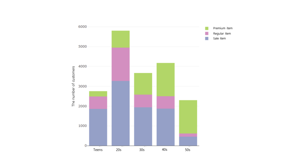 Next, we dig deeper into customer segmentation by analyzing purchase behavior across different age groups, as illustrated in Figure 2. This analysis reveals which age groups make the most purchases and their preferences for specific product categories. In this case, customers in their 20s are the most frequent purchasers, followed by those in their 40s and 30s. Notably, customers in their 20s show a higher propensity for buying sale items, while customers in their 50s tend to prefer premium products.