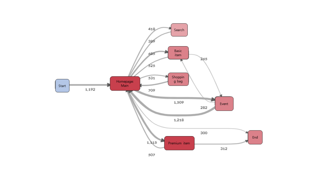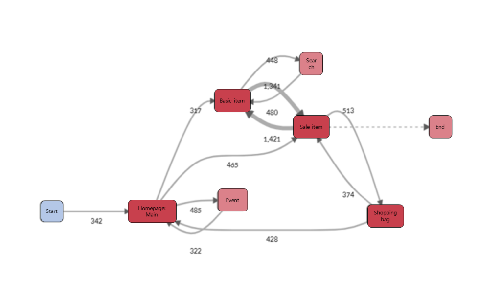 By examining the customer journey maps for each group, as shown in Figure 6 (for Group 2) and Figure 7 (for Group 4), we can observe how the preferences and behaviors of these groups manifest. For instance, Group 2 customers display a strong inclination towards sale items, with a frequent transition from the main homepage to sale items. In contrast, Group 4 customers exhibit a pronounced preference for premium products, with a focus on the main homepage and event pages.