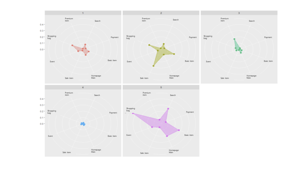 In Figure 5, we illustrate the characteristics of each group using a radar chart. Group 2, for example, displays a high preference for sale items compared to other groups. Group 3, on the other hand, shows a strong interest in premium products. Group 5 exhibits a higher overall engagement with the website, with a particular focus on search, regular products, and the shopping cart.