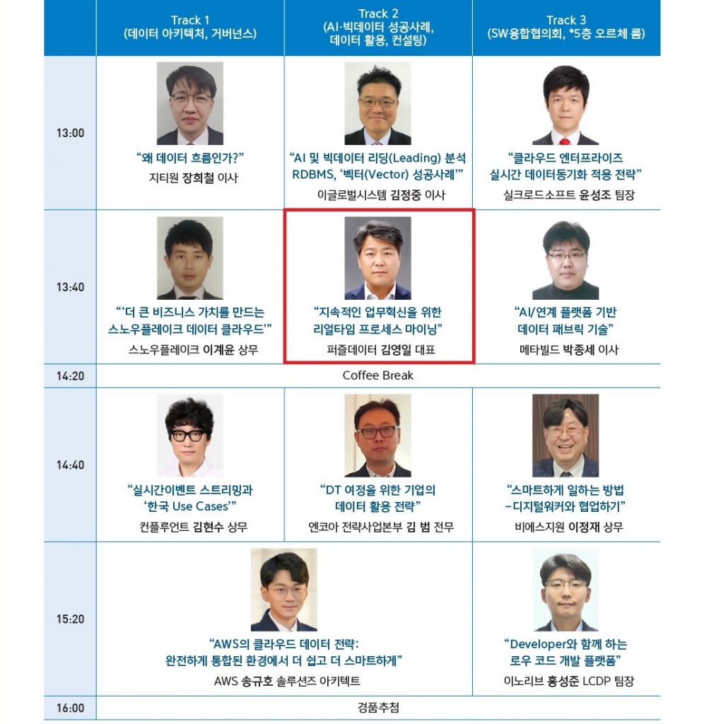 • 퍼즐데이터 발표: 13:40~14:20, Track2 “지속적인 업무혁신을 위한 리얼타임 프로세스 마이닝” 김영일 대표이사