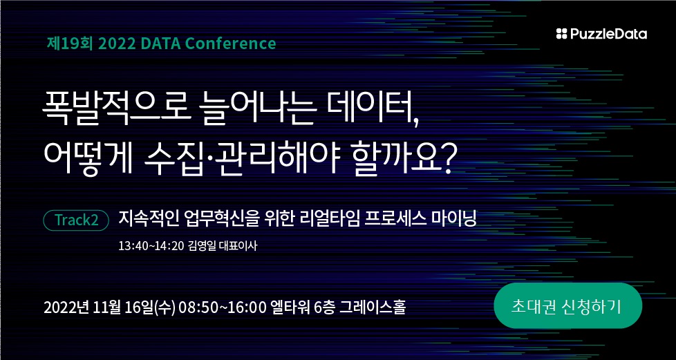 퍼즐데이터가 11월 16일(수) 양재 엘타워에서 열리는 제19회 2021 DATA Conference “폭발적으로 늘어나는 데이터, 어떻게 수집·관리해야 할까요?”에 세션발표와 부스로 참가합니다. 퍼즐데이터 발표는 13:40부터 14:20까지 40분간 Track2에서 “지속적인 업무혁신을 위한 리얼타임 프로세스 마이닝”이라는 주제로 퍼즐데이터 김영일 대표가 발표를 진행합니다.