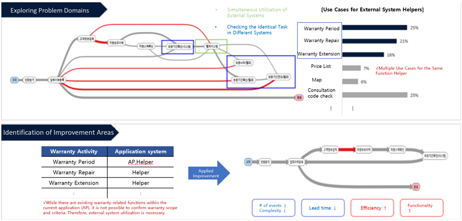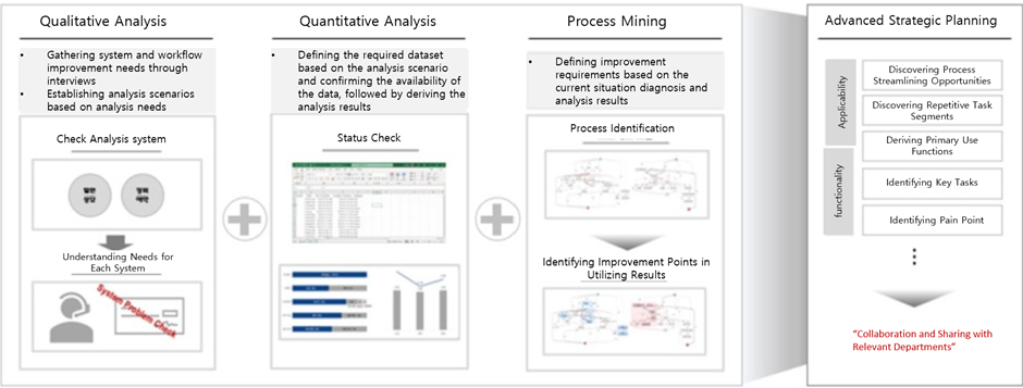 Process mining can efficiently complement and integrate these approaches. By collecting logs containing the actions of workers and applying process mining, it becomes possible to quickly identify system issues and tasks that workers find challenging. Furthermore, process mining can provide evidence-based support for the problems identified through qualitative methods. In this case, as shown in [Figure 2], a combination of qualitative and quantitative methods with process mining was used to enhance the formulation of UI/UX strategies.