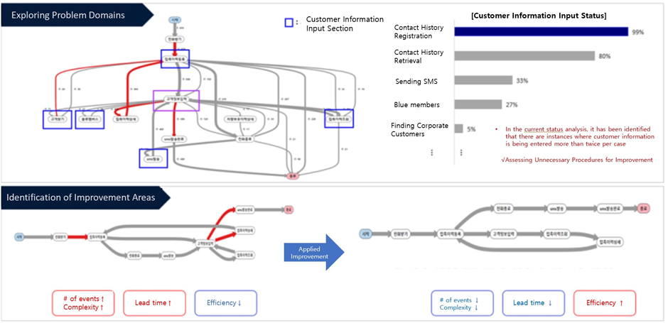 Process mining is utilized in various fields such as finance, manufacturing, logistics, and more. It is primarily used to identify areas for process improvement, automation, or to extract factors that can enhance customer usability and convenience through the analysis of customer behavior. In recent cases, process mining has been applied to the overhaul and integration of systems in call centers.