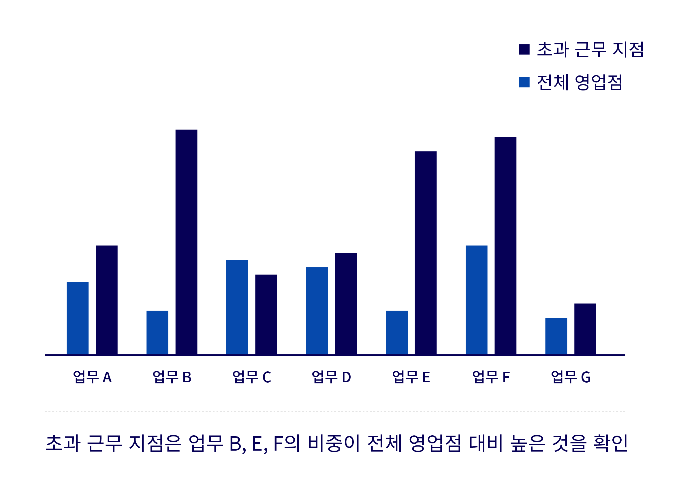 해당 작업들은 전체 영업점 대비 초과 근무 지점에서 높은 업무 비중을 차지