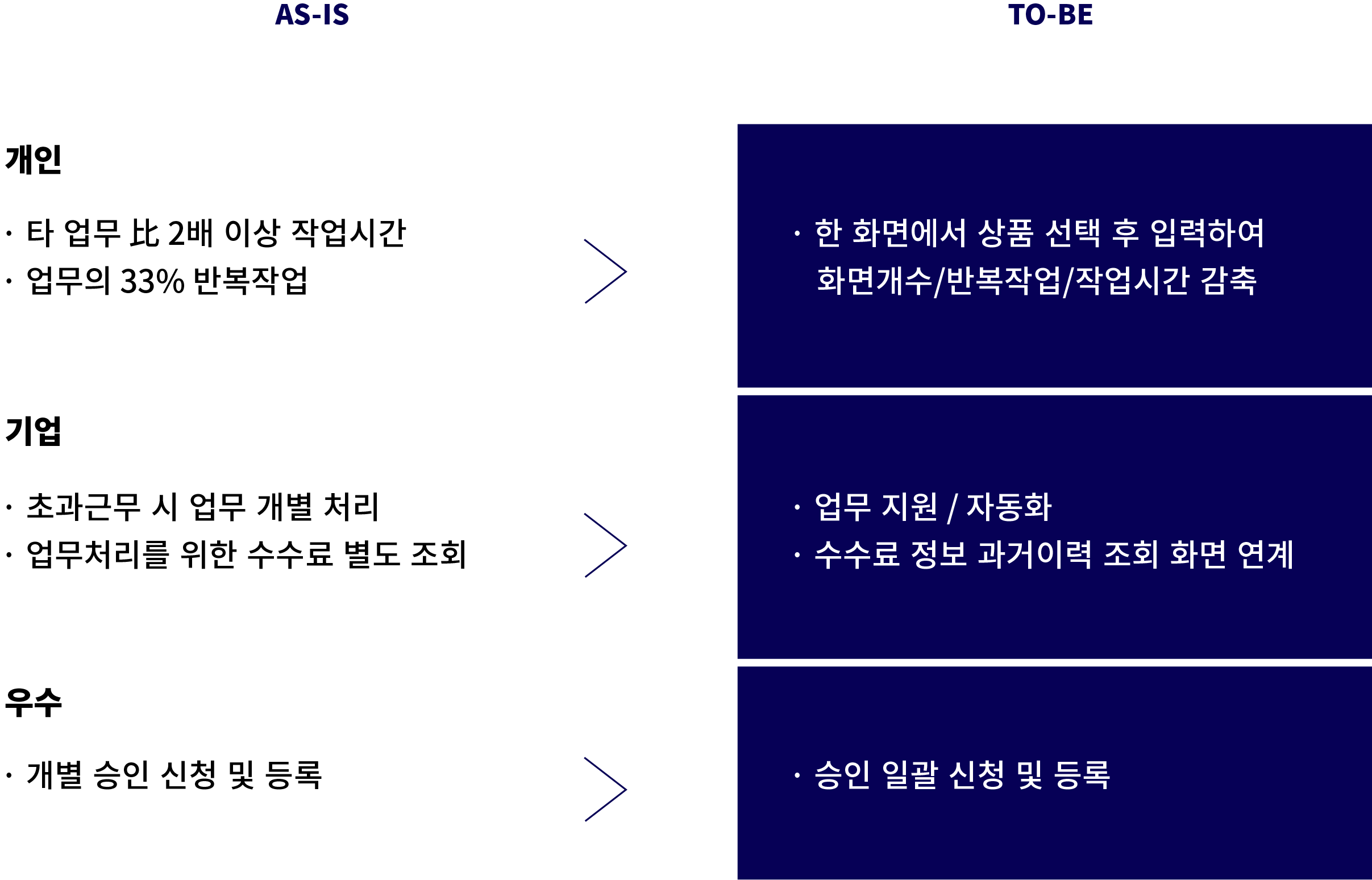 - 프로세스 맵과 분석 결과를 고려 해당 업무를 개선점으로 삼고, TO-BE에 대한 액션 계획