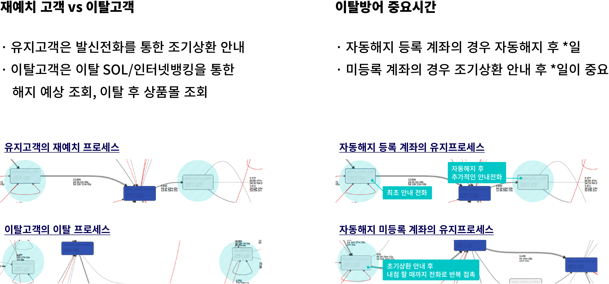 - 유지고객의 패턴 : 발신전화를 통한 조기 상환 안내 이후 재예치로 이어짐
