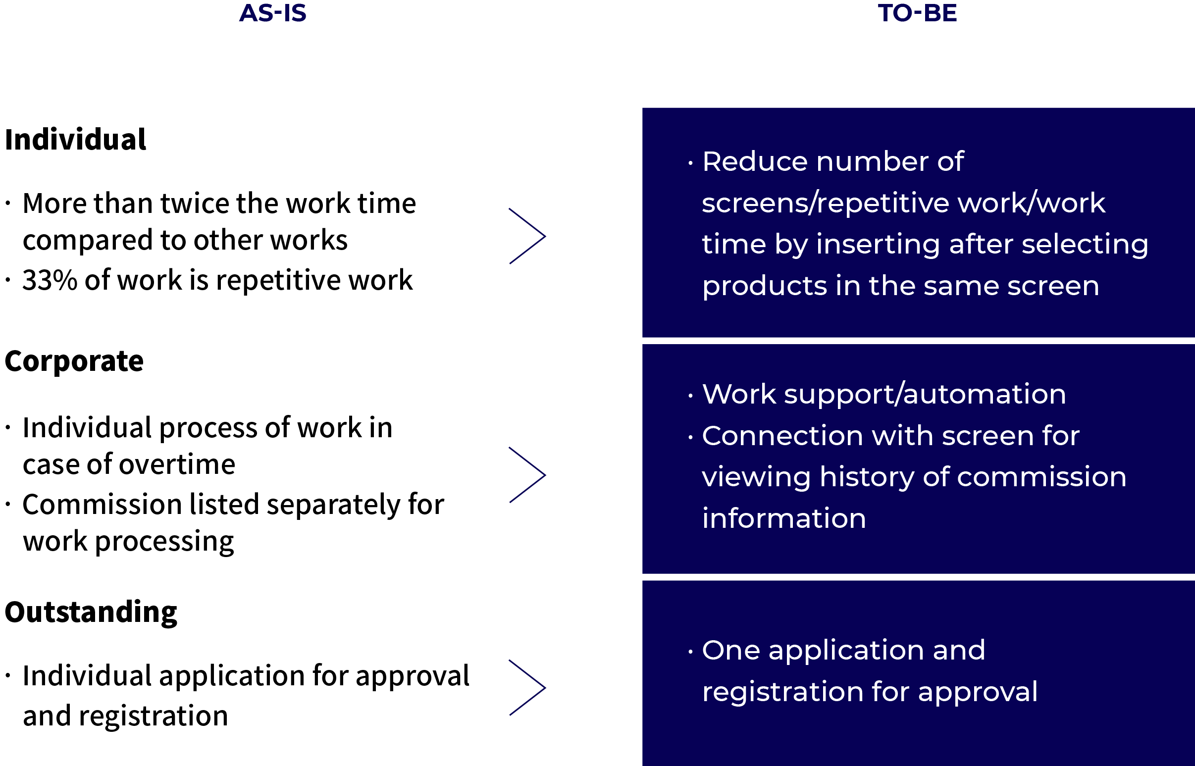 Improvement of customer experience and work convenience of employees in sales branch and departments in head office through analysis of customer’s behavior pattern and employee’s work process
