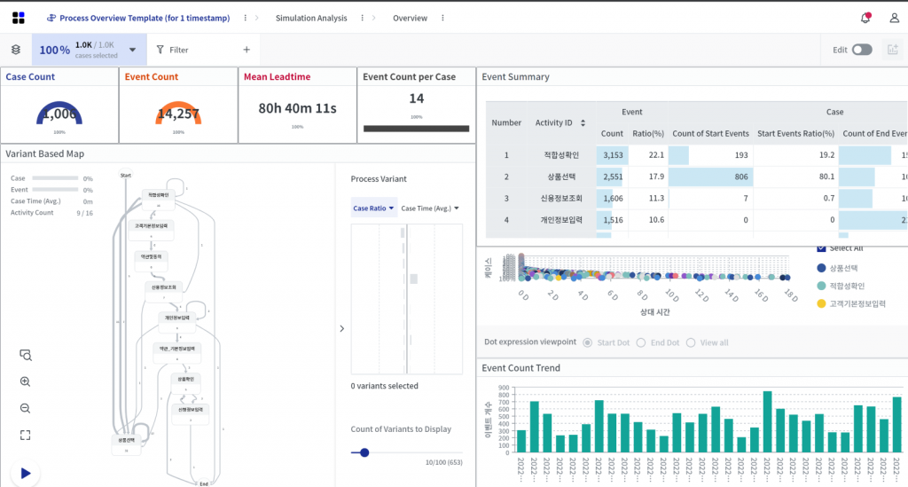 프로세스 마이닝은 이를 위해 전체 프로세스 관점에서 그 안에 담겨있는 조직, 설비, 업무, 일정, 고정 속성 등 다양한 요소들을 고려하여 통합된 업무 프로세스 모델과 관련 지표들에 대한 가시화 기능을 제공합니다.