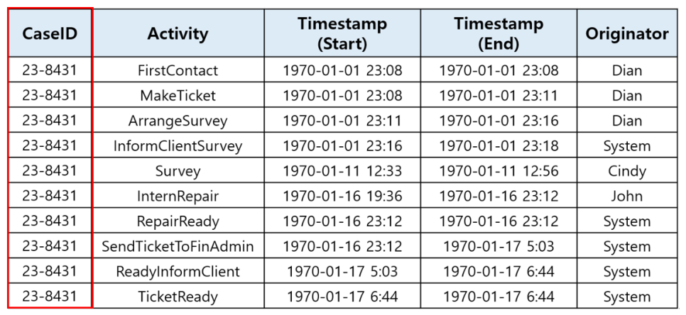 ​Case ID의 간단한 정의는 하나의 프로세스를 표현할 수 있는 열입니다. 하지만 전 그것보단 프로세스의 범위를 결정하는 열이 더 적절하다고 생각합니다. 따라서 Case ID를 지정하는 행위는 프로세스의 범위를 지정하는 행위입니다. 예시 데이터를 통해 자세히 설명하겠습니다.