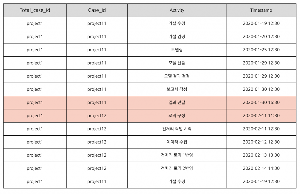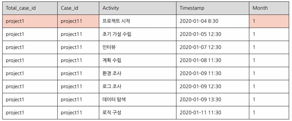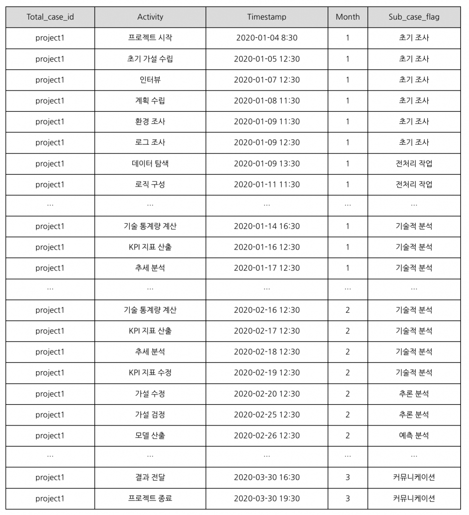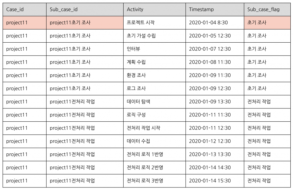 ● Case ID : 하나의 프로세스를 표현할 수 있는 열. 프로세스는 시작과 종료가 존재하고 프로세스가 시작하고 종료할 때까지 동일한 값을 가지고 있는 열을 Case ID로 선정한다.
