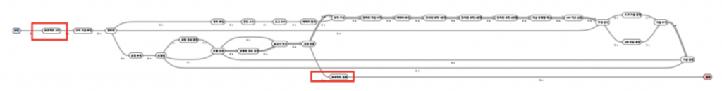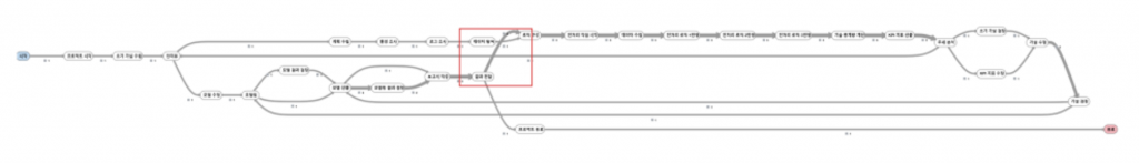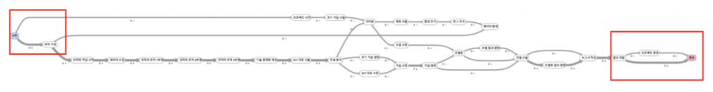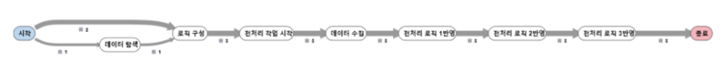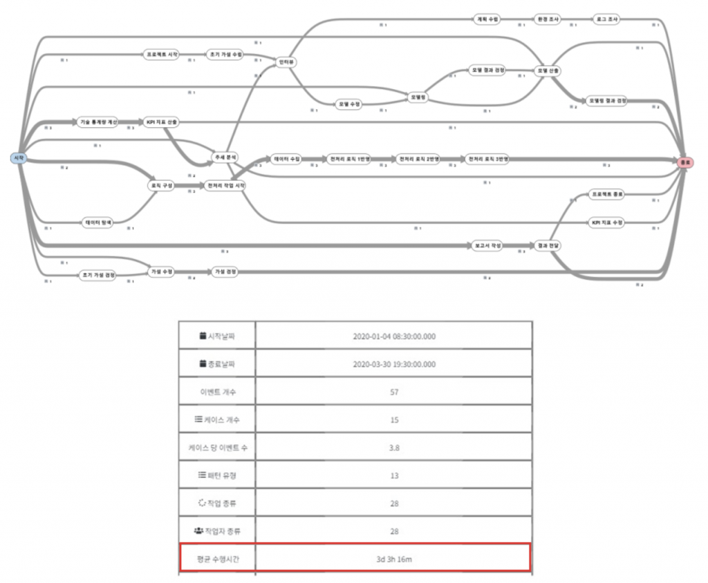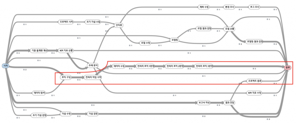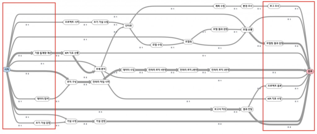 같은 데이터를 사용하였지만 프로세스 맵이 변화했습니다. 가장 큰 변화는 프로세스 시작이 프로젝트 시작 Activity와 로직 구성 Activity 두개로 나뉘었고 프로세스 종료가 결과 전달 Activity와 프로젝트 종료 Activity로 나뉘었습니다.