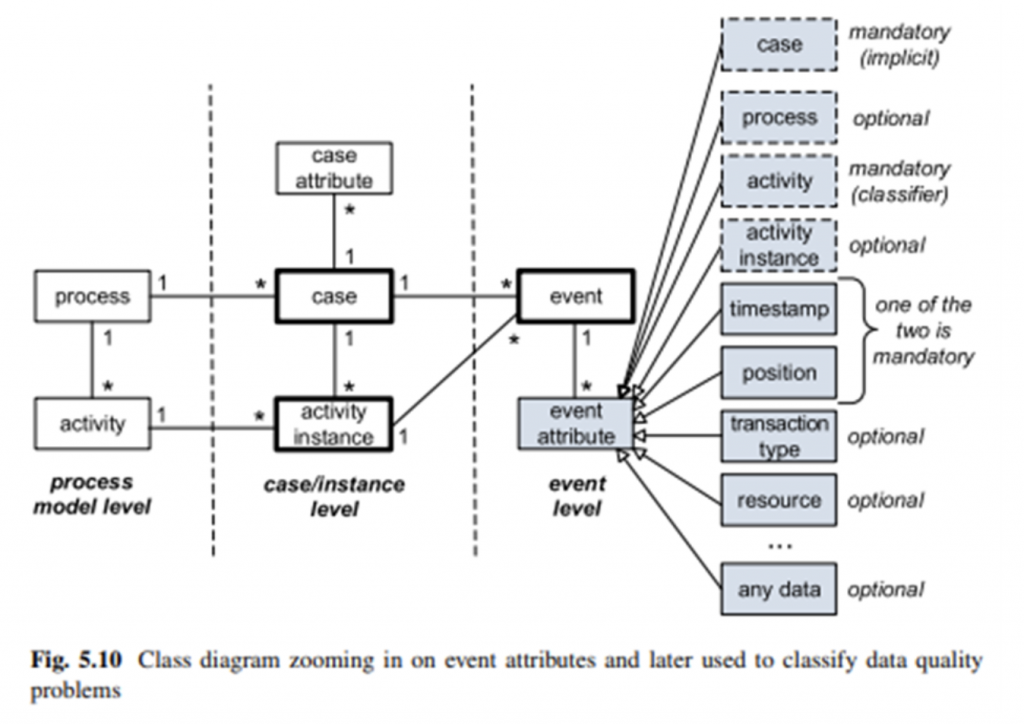 Process Mining은 log 데이터를 이용하여 Process Model을 자동으로 도출합니다. 이때 필요한 정보는 오직 Case, Activity, Order입니다. 아래 Process Mining Event log concept을 확인하면, 필수 정보로 Case, Activity, (Position/Timestamp) 중 택 1임을 확인할 수 있습니다. Position/Timestamp 택 1인 이유는 둘 중 하나의 정보가 존재한다면, Activity의 순서를 알 수 있고 이를 통해 기본적인 Process flow를 모델링 할 수 있기 때문입니다.