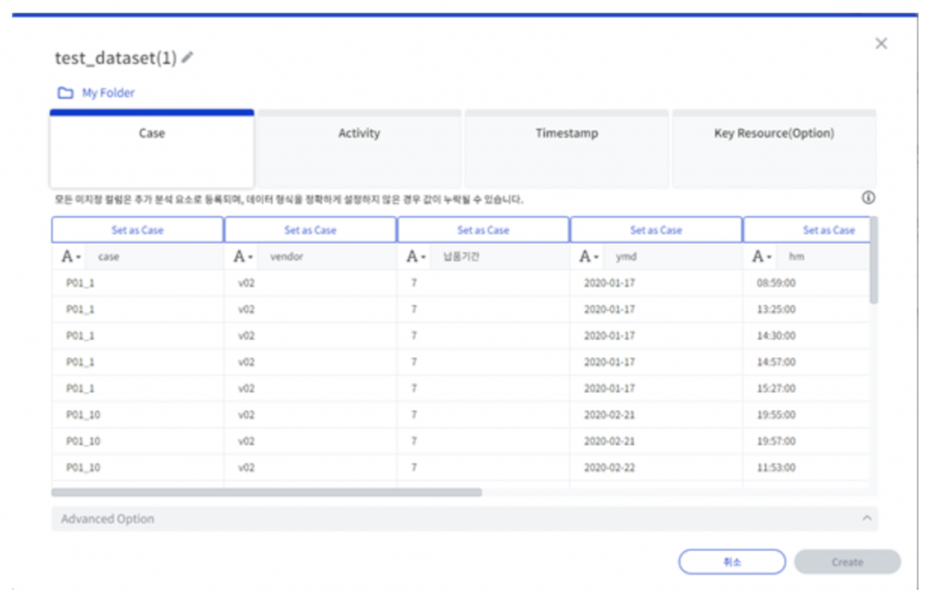 현재 ProDiscovery는 Position/Timestamp 중 Timestamp만을 지원합니다. 이벤트 소스에 Dataset을 생성할 때 Case, Activity, Timestamp를 필수 요소로 지정합니다. 실제 대부분의 IT 시스템에선 log 데이터에 position 정보가 없고, Timestamp가 기록되기 때문에 Timestamp만 사용해도 큰 문제가 없습니다.