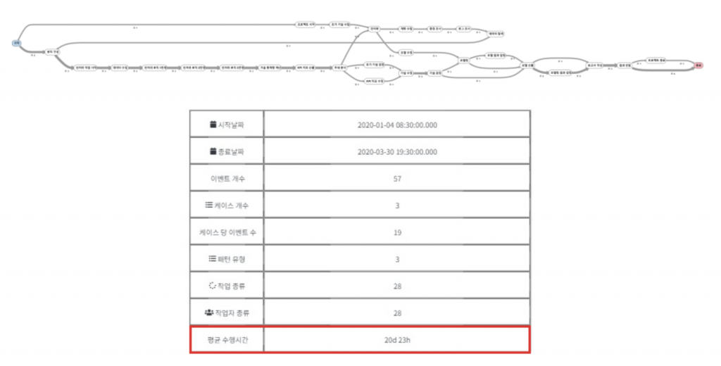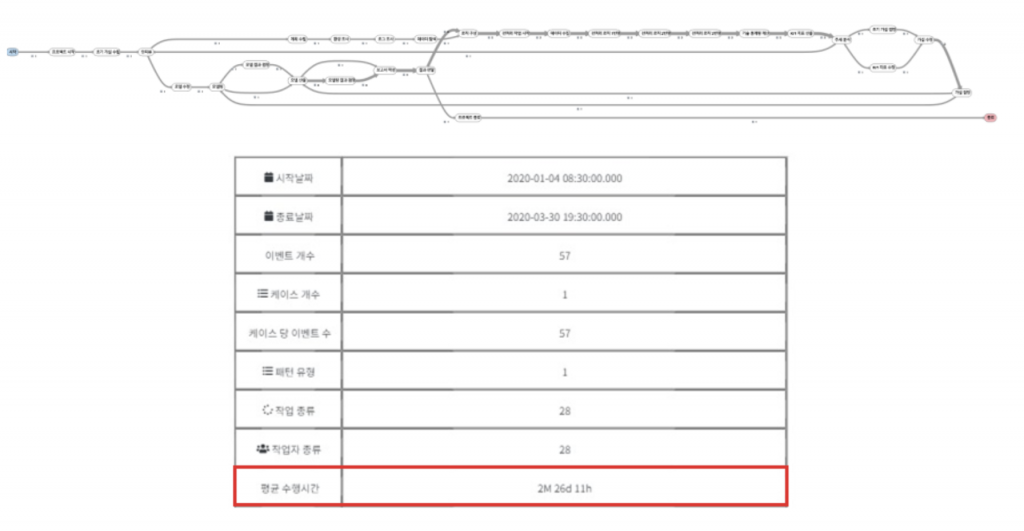 또 한 가지 주의해야 할 점이 존재합니다. Total Case ID의 총 수행 시간은 2달 26 => 약 2075시간입니다. Case ID의 총 수행 시간은 20일 23시간 * 3 => 약 1509 시간입니다. 이 둘의 차이점을 의아하게 생각하는 경우가 존재합니다. 이런 차이가 발생하는 이유는 Case ID에서 하나의 주제가 끝난 후, 그다음에 시작하는 주제의 대기 시간이 Total Case ID에는 포함되어 있기 때문입니다.